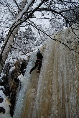 Swing, crack, BOOM. A 25 metre high cascade of ice vibrates from deep inside to the first impact of my ice tool. Hmmmm, bad vibes - literally. The ice is dull and dense in the deep cold, lifeless in comparison the moist sparkle of new ice just a little below freezing point. The monopoints of my crampons puncture the ice but the secondary points fail to gain much purchase on it's hard shell. One foot pops when I'm just a metre or so up. They refuse to provide the secure feeling you normally find on ice that is less than vertical.